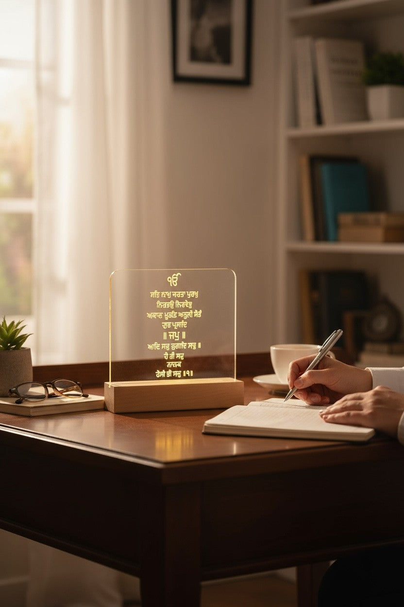 Mool Mantra Lamp, Gurmukhi Script Decor, Spiritual LED Illumination, Sikh Home Altar, Contemporary Meditation Lighting, Divine Energy Lamp, Sacred Mantra Decor, Unique Spiritual Gift, Modern Sikh Art, Tranquil Meditation Room Accent.